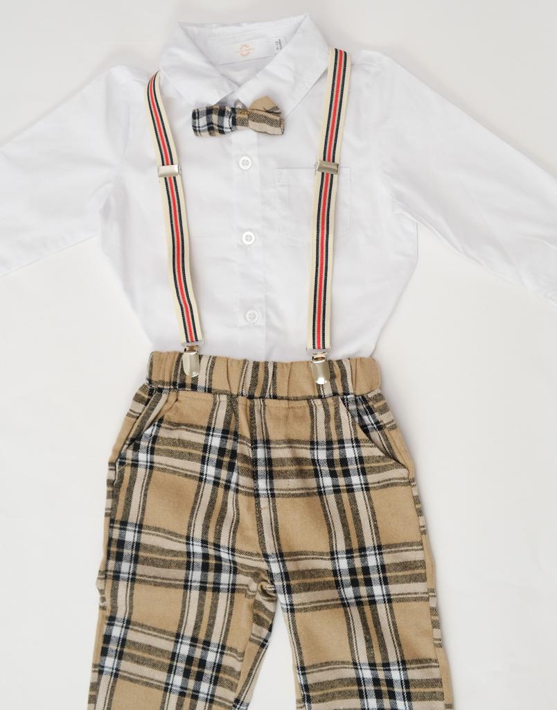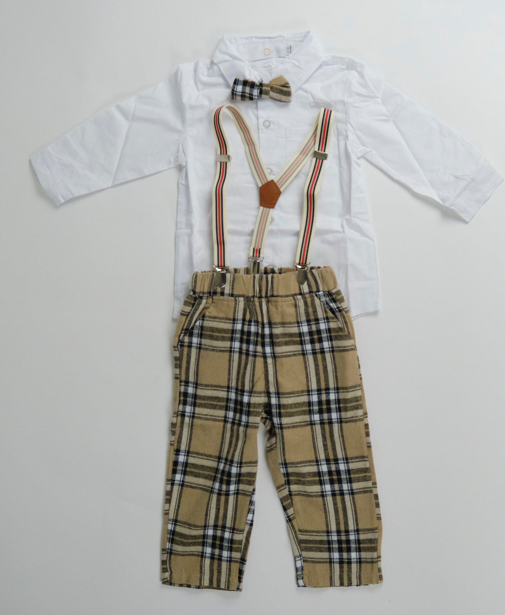 This is cute and comfortable boys set. It is light weight  and can worn on any occasion. it's two piece with shirt (suspenders and bow tie) and trouser.